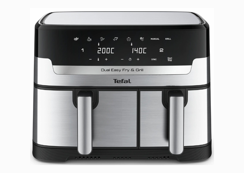 Мультипіч (Аерогриль) Dual Easy Fry & Grill Air Fryer TEFAL EY905D10 — з двома чашами, об’ємом 8,3 л для приготування двох різних страв — від м’яса та картоплі фрі до смаженої риби та овочів на грилі. Технологія: Extra Crisp - циркуляція потоків гарячого повітря, SYNC - синхронізація приготування 2 різних страв.